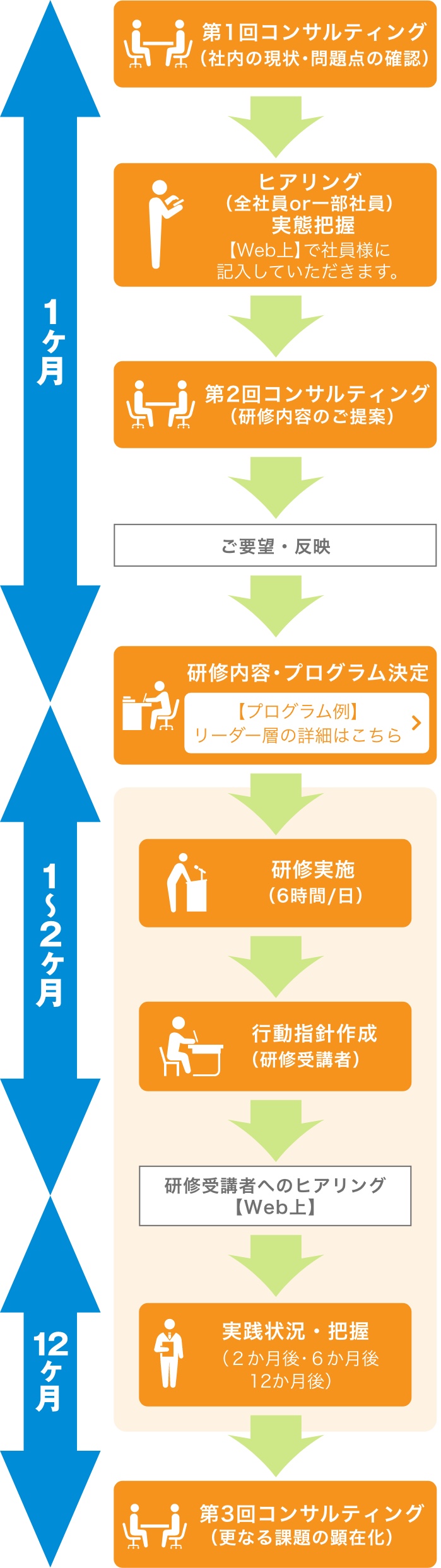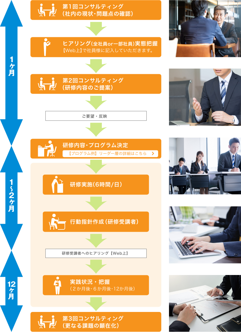 貴社に潜在する諸課題をヒアリングによって顕在化し、それを研修に落とし込み、研修実施→行動指針作成→実践→経過観察を経て、改善を図ります。